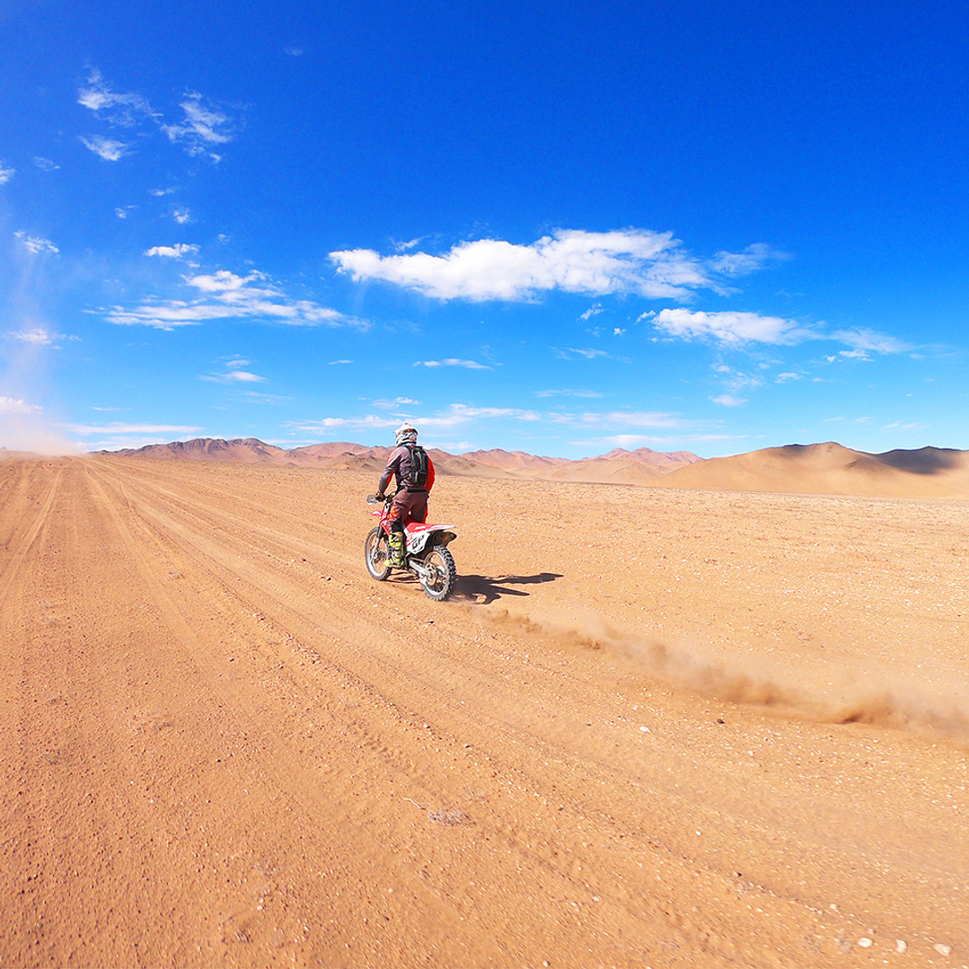 Guided tour by Felipe Prohens from Bahía Inglesa. We go through the best sectors to ride a motorcycle. Route mainly on sand. We have assistance en route and at the base of operations. Optional accommodation is at Hotel Rocas de Bahía in double or triple rooms (includes breakfast).